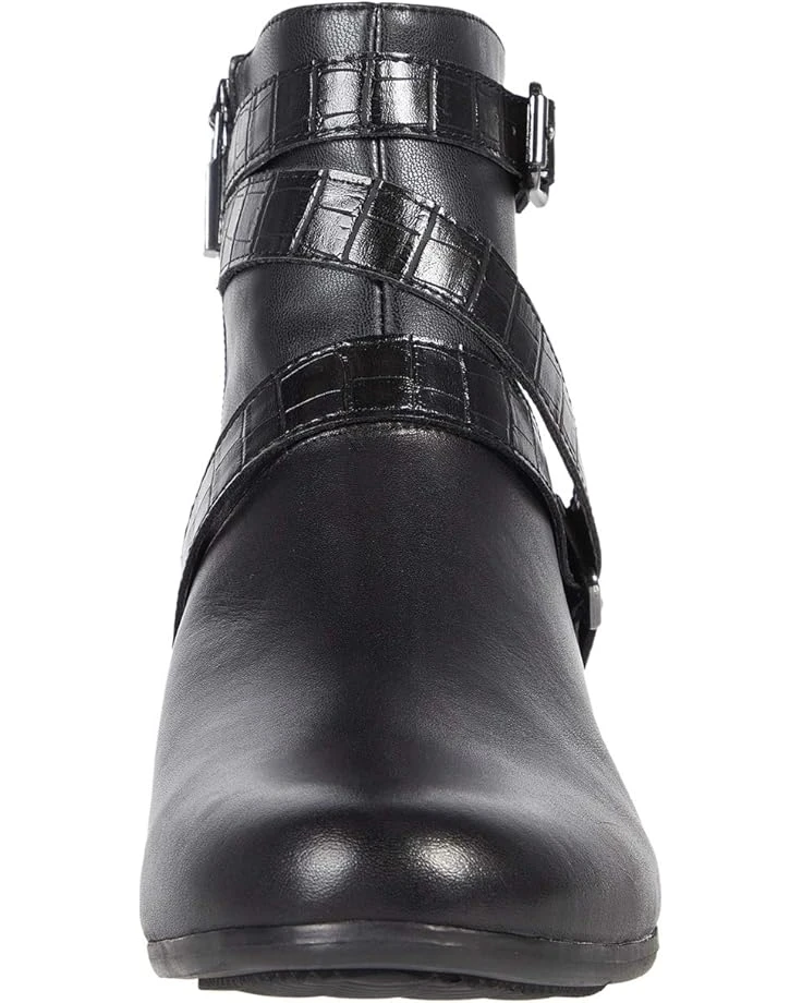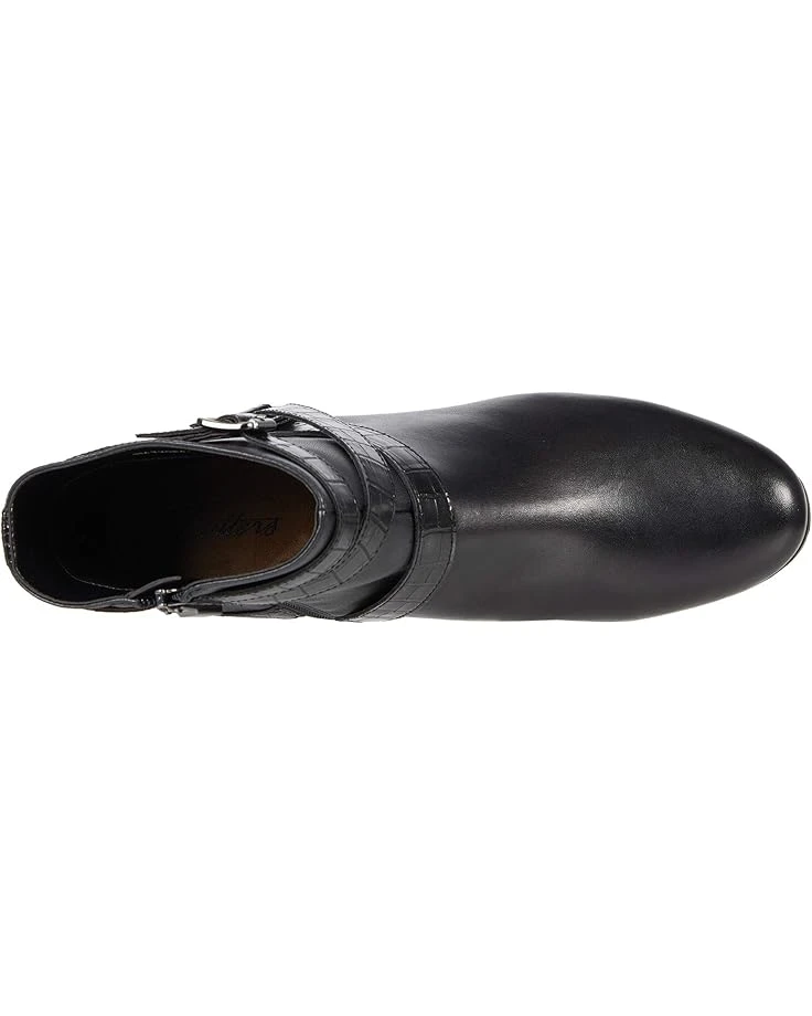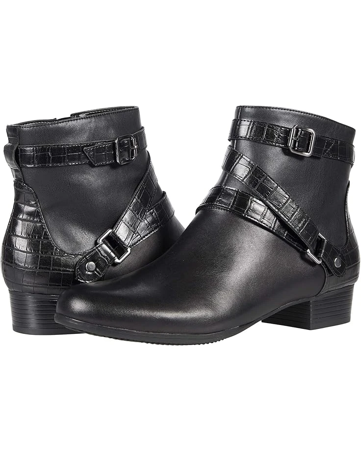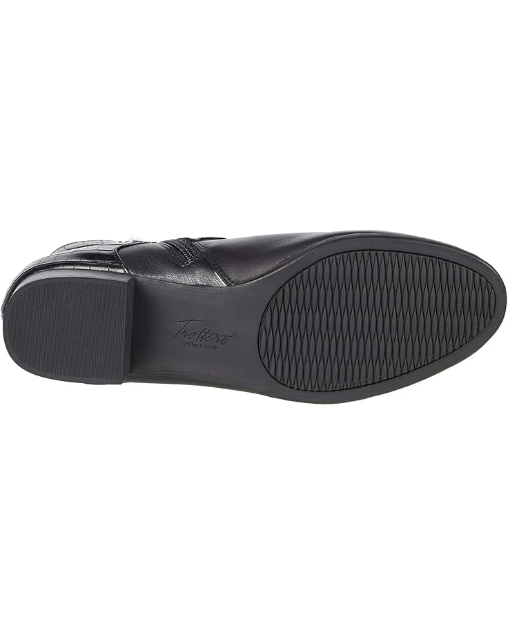- Seal off your look wearing the Trotters® Mika boot with a leather and synthetic upper, side zip closure, and crisscrossing croc-embossed strap accents.