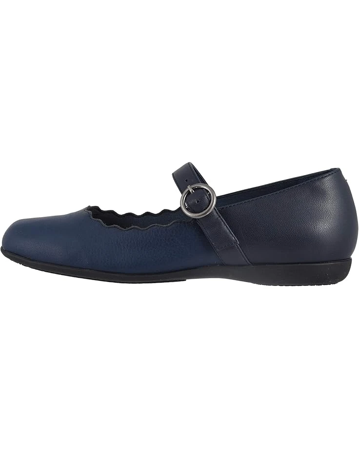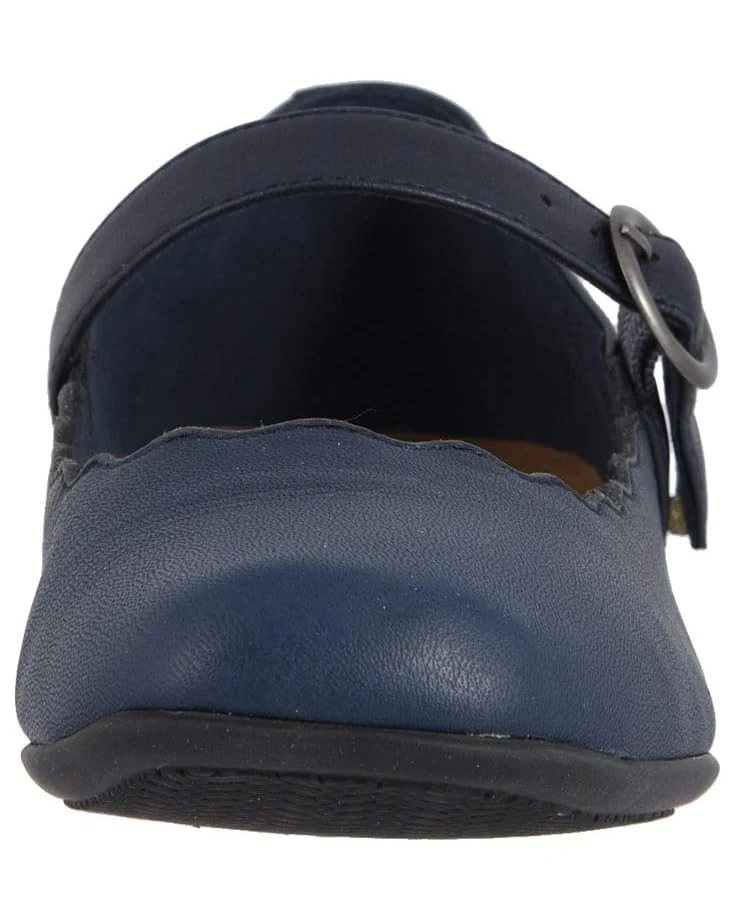 I like this shoe even more than I expected! It is a well made, comfortable shoe – the leather is soft and supple, the footbed is cushiony. The square toe and scallopped design make it very feminine. Normally, I wear either a 9 1/2 or a 10 (always a Medium width). This shoe fits me perfectly in a 9 1/2 M. The heel does slip ever so slightly, but the Mary Jane strap is adjustable so when I tightened it a little that issue went away. I ordered it in the navy blue and while I like the color it is darker than the picture suggests. When I first opened the box I thought I had received the black, but on closer inspection in the light it is a true navy blue. Overall, a really nice shoe! Good value, style and comfort